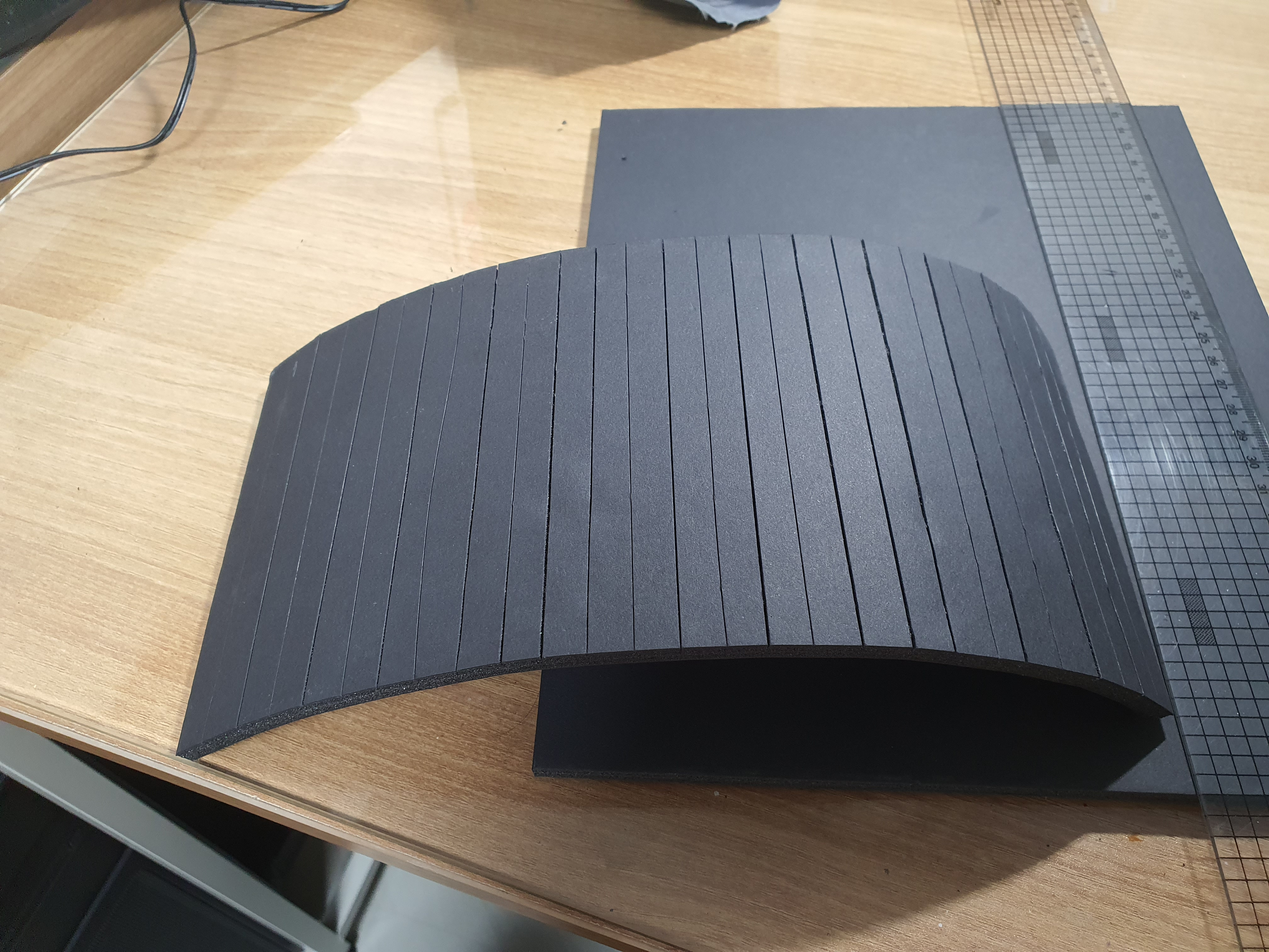 아랫면의 종이가 잡아주기 때문에 폼보드를 위의 사진처럼 곡선 형상으로 구부릴 수 있다.