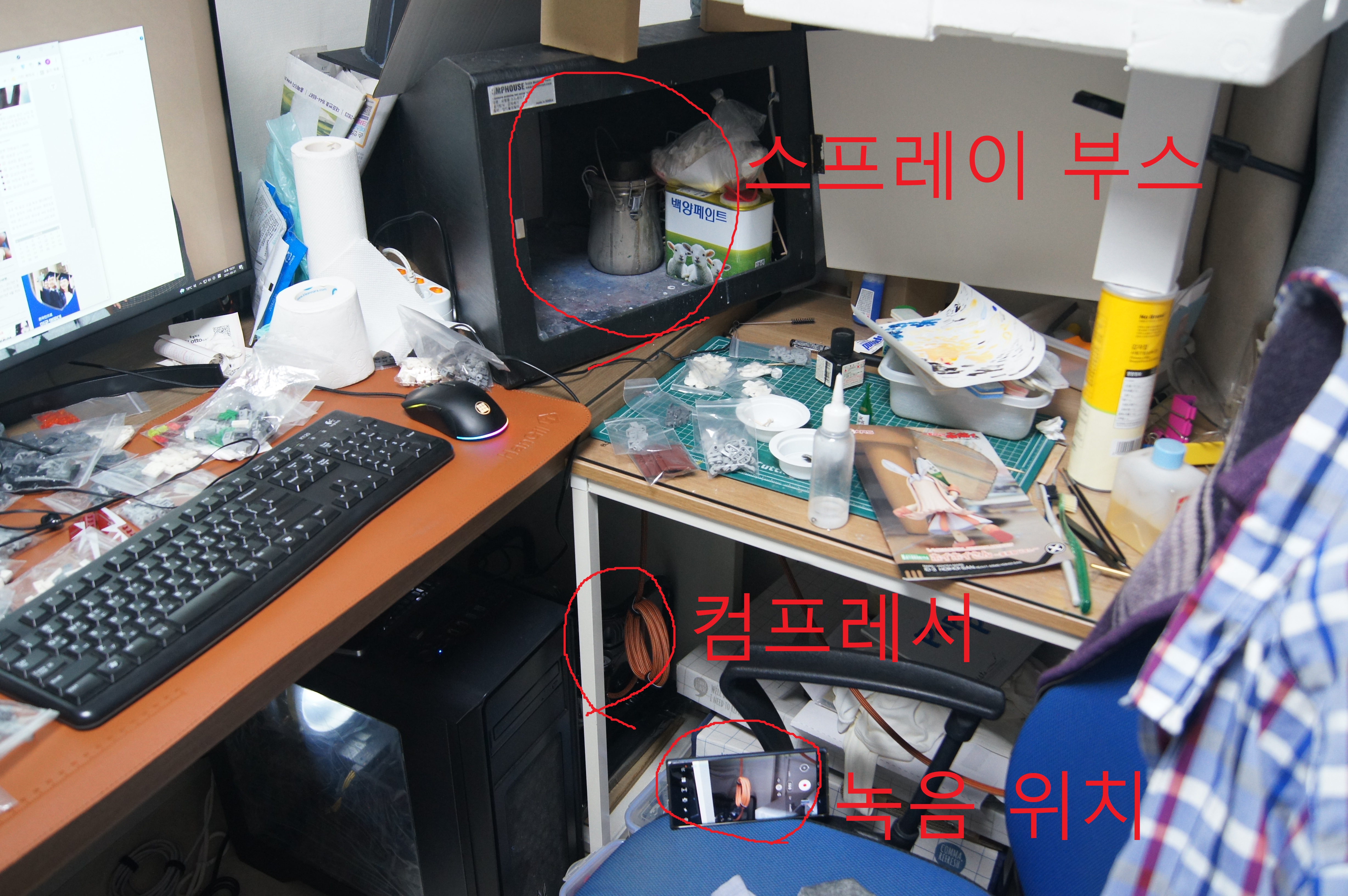 컴프레서와 스프레이 부스는 각각 책상 아래와 책상 위에 자리하고 있고, 녹음의 위치는 의자 위로 대충 비슷한 거리일 듯싶다.