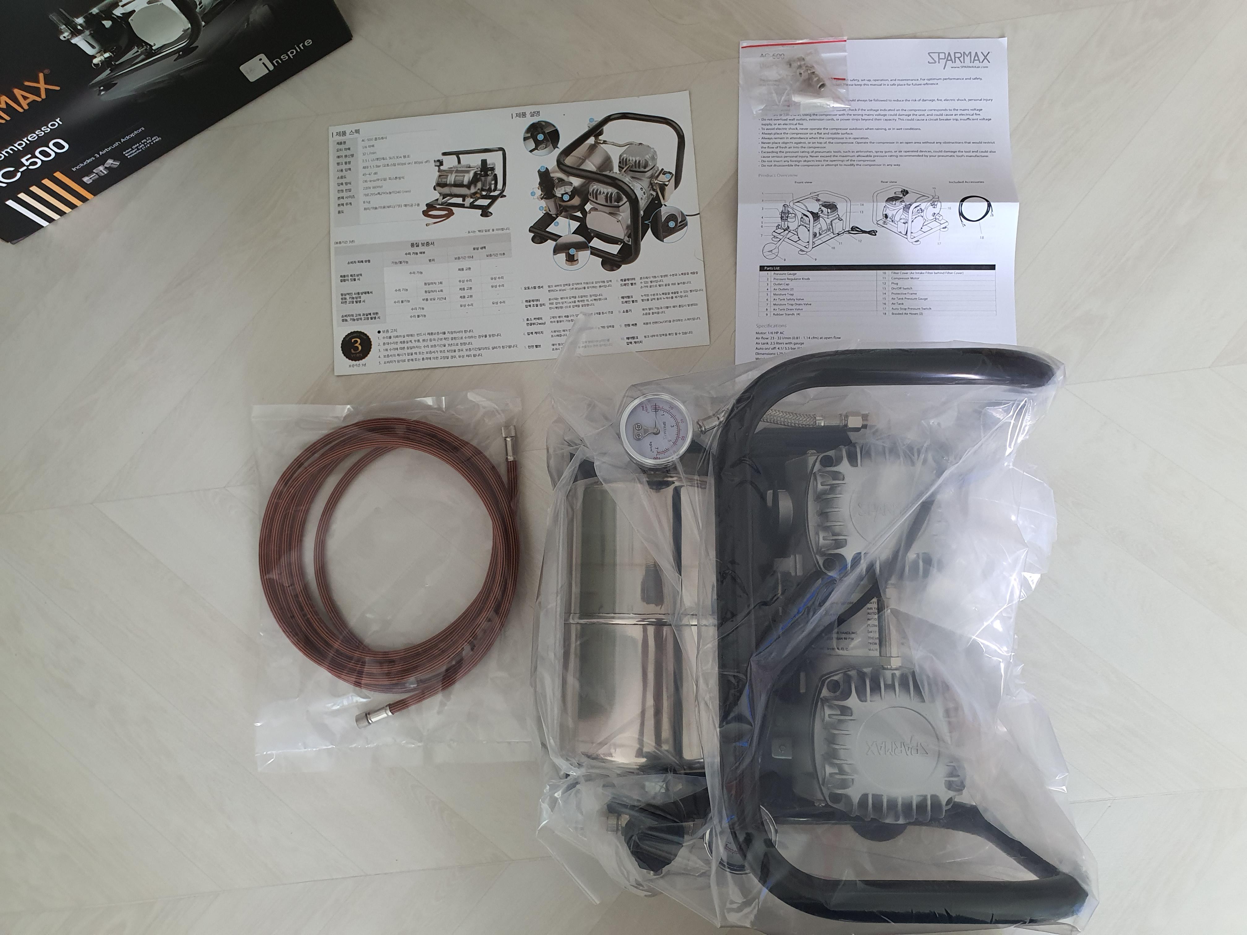 한글로 된 설명서와 외국어 설명서, 에어브러시 어뎁터.