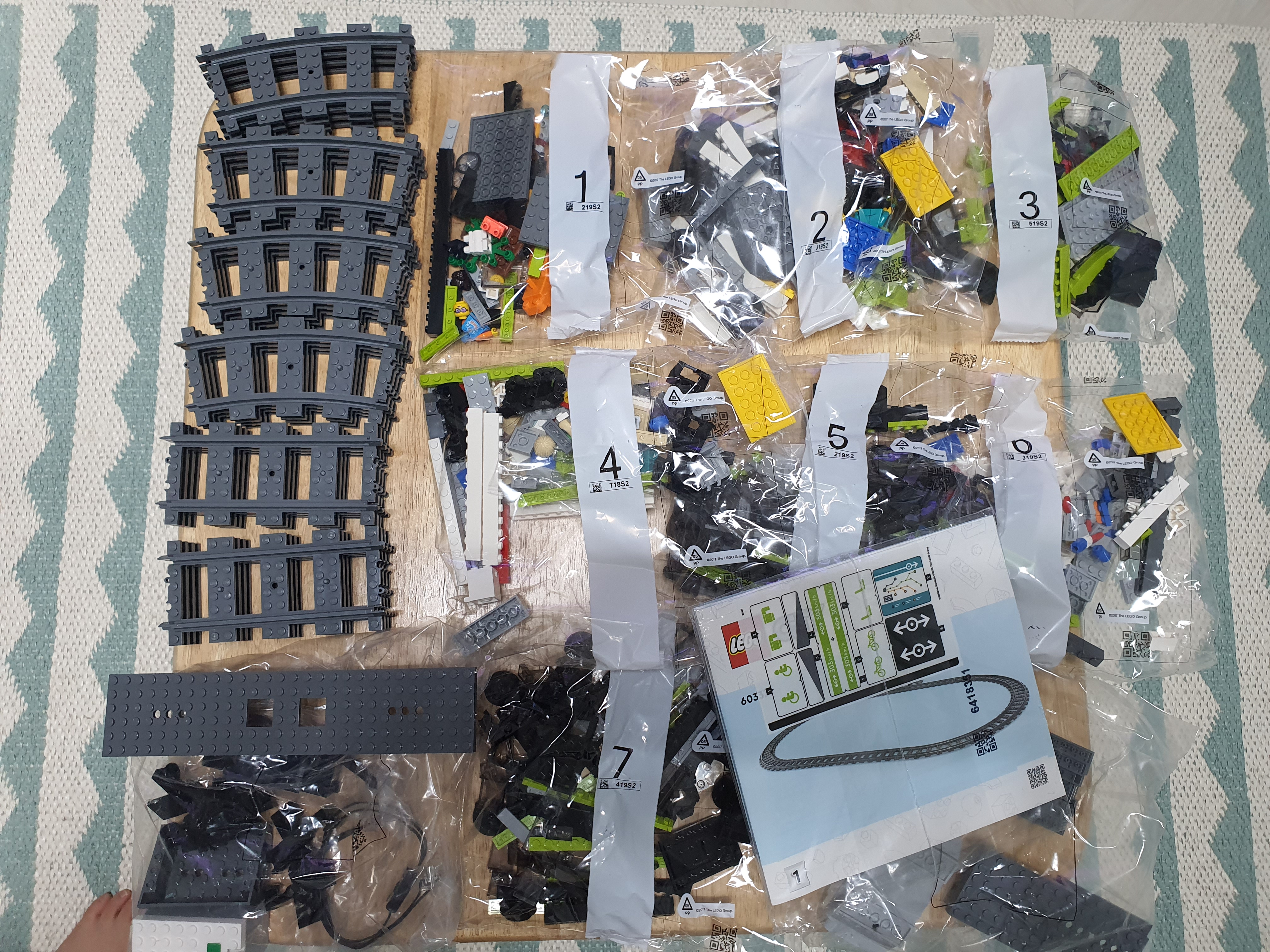 레일, 기차 베이스 판 1개, 7개의 부품 봉지와 2개의 개별 봉지, 그리고 설명서와 스티커까지 구성은 풍성한 듯.