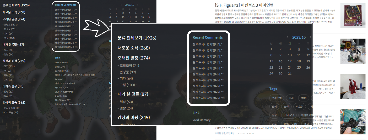 개인적으로는 변방에서 메인 스트림(?)으로 진입한 것으로 생각했지만, 내 홈피의 방문자 수는 크게 변하는 일은 없었다.(^^;;; 아마 이 무렵부터 내가 다루는 이야기들의 화제성과 내 글솜씨에 대한 객관적인 평가가 가능하지 않았나 싶은데...) 아무튼 홈피에서 블로그로 플랫폼이 바뀌고, 관리 창이 달라지고, 게시판의 디자인이 업그레이드되었다는 외형적인 변화를 제외하고, 이 공간은 이전과 크게 달라진 것이 없었다. 이 공간에 제일 많이 방문해서 글을 찾아보고 읽는 것은 언제나 '나'였으며, 가끔 지인들이 방문해서 댓글을 남기는 오프라인의 연장선 정도의 공간이었다.