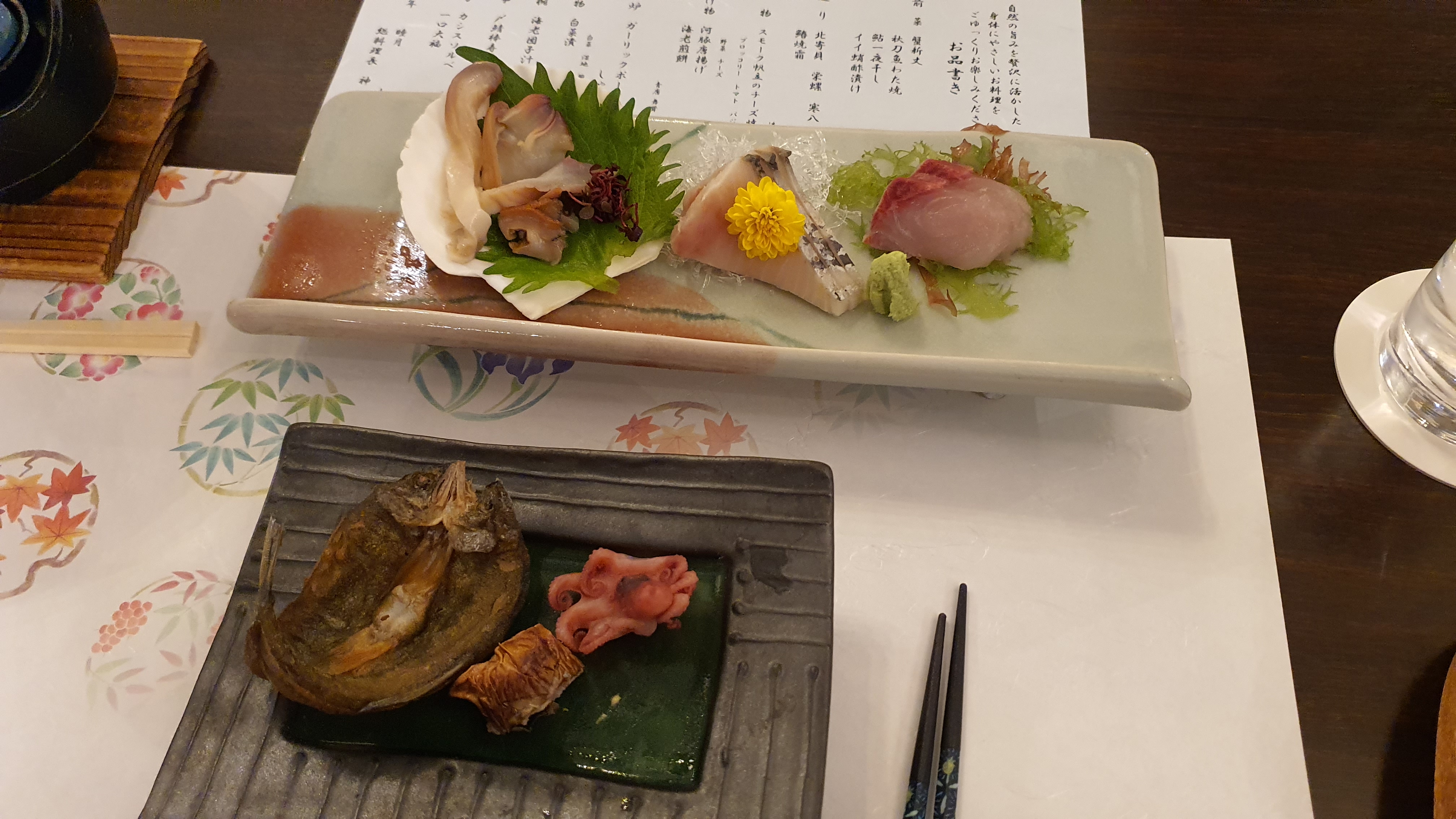 아래는 미리 준비되어 있던 전채이고 위는 첫 번째로 내어 준 해산물과 회.