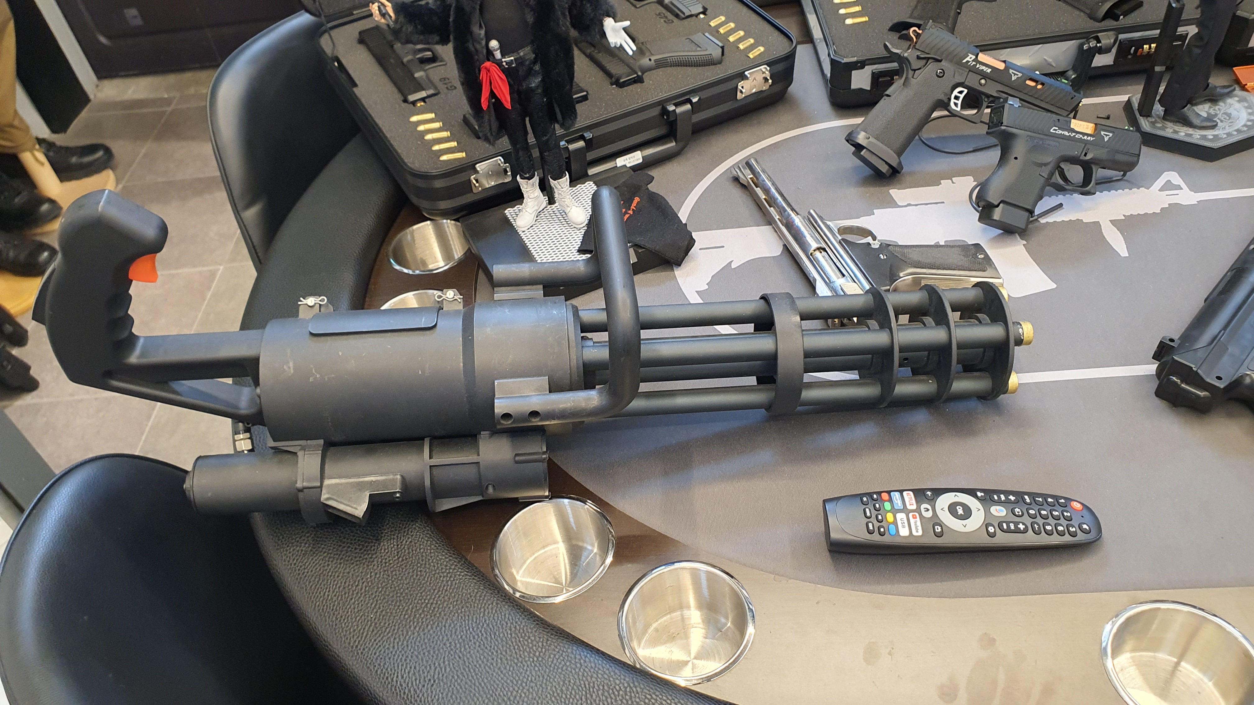 기본 서비스에 포함된 음료, 장비 착용 경험 말고 또 다른 서비스로, 테이블에 권총 모델건을 주고 직접 만져볼 수 있게 해주는 것이 있다.